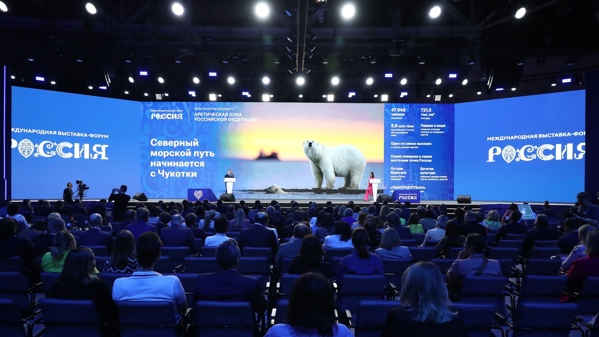 На международной выставке – форуме «Россия» были представлены экономические и социальные проекты, направленные на развитие инфраструктуры Арктики. Всего проведено более 30 мероприятий. Активное участие в них принимали учёные. Были оформлены красочные экспозиции арктических регионов, а также тематические – по самым разным направлениям освоения Арктики. Сквозным было обсуждение проблем развития Северного морского пути – стимула для освоения ресурсов Арктики, нового логистического маршрута, который позволит беспрепятственно осуществлять транспортировку нефти, природного газа, газоконденсата и угля, добытых на российской территории Арктики.